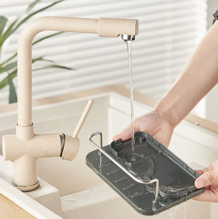 Está fabricado en acero inoxidable, proporcionando un espacio organizado para herramientas de lavado de platos. El dispensador de jabón mantiene el jabón al alcance en encimeras y fregaderos, mientras que el soporte de esponja ofrece un lugar conveniente para almacenar esponjas, fregadores, cepillos y otros utensilios.